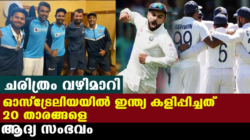 20 താരങ്ങളെയാണ് നാലു ടെസ്റ്റുകളുടെ ബോര്ഡര്- ഗവാസ്കര് ട്രോഫിയില് ഇന്ത്യ ഇതിനകം കളിപ്പിച്ചത്. 1961-62നു ശേഷം ആദ്യമായാണ് ഇന്ത്യ ഒരു പരമ്പരയില് ഇത്രയുമേറെ കളിക്കാര്ക്കു അവസരം നല്കിയത്. ഒരു വിദേശ പര്യടനത്തില് ഇന്ത്യ ഇത്രയും താരങ്ങളെ കളിപ്പിച്ചതും ഇതു ആദ്യമായിട്ടാണ്.