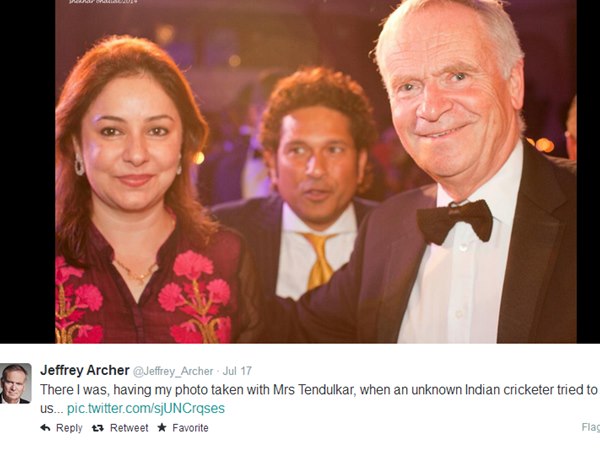 ലണ്ടന്: മിസ്സിസ് തെണ്ടുല്ക്കര്ക്കൊപ്പം ഫോട്ടോ എടുക്കുമ്പോള് ഇടയില് കയറിയ അണ്നോണ് ക്രിക്കറ്റര് - ഇങ്ങനെ ഒരു അടിക്കുറിപ്പോടെ സച്ചിന്റെ കുടുംബ ഫോട്ടോ ട്വിറ്ററില് വൈറലാകുന്നു. ആരാധകര് വാളെടുക്കാന് വരട്ടെ, പടമിട്ടത് ജെഫ്രി ആര്ചറാണ്. മുന് രാഷ്ട്രീയ നേതാവും ഇംഗ്ലണ്ടിലെ ബെസ്റ്റ് സെല്ലറുമായ ജെഫ്രി ആര്ചര്.