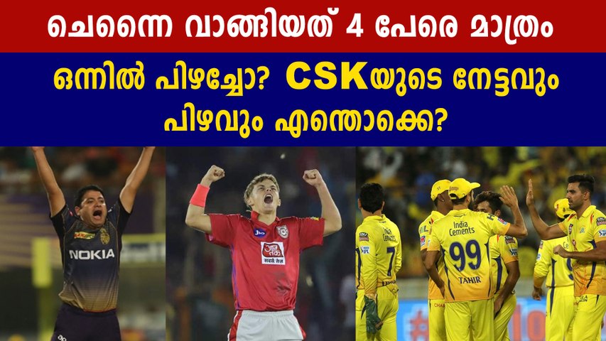 ഇംഗ്ലണ്ടിന്റെ യുവ ഓള്റൗണ്ടര് സാം കറെനെ ടീമിലേക്കു കൊണ്ടു വരാന് സാധിച്ചതാണ് ലേലത്തില് സിഎസ്കെയുടെ ഏറ്റവും വലിയ നേട്ടം. കഴിഞ്ഞ സീസണില് കിങ്സ് ഇലവന് പഞ്ചാബിനൊപ്പമായിരുന്നു താരത്തിന്റെ അരങ്ങേറ്റം. ചില തകര്പ്പന് പ്രകടനങ്ങളും കറെന് കാഴ്ചവച്ചിരുന്നു. മികച്ച ബൗളര് മാത്രമല്ല അതിവേഗം റണ്സ് നേടാന് ശേഷിയുള്ള ബാറ്റ്സ്മാന് കൂടിയാണ് കറെന്.