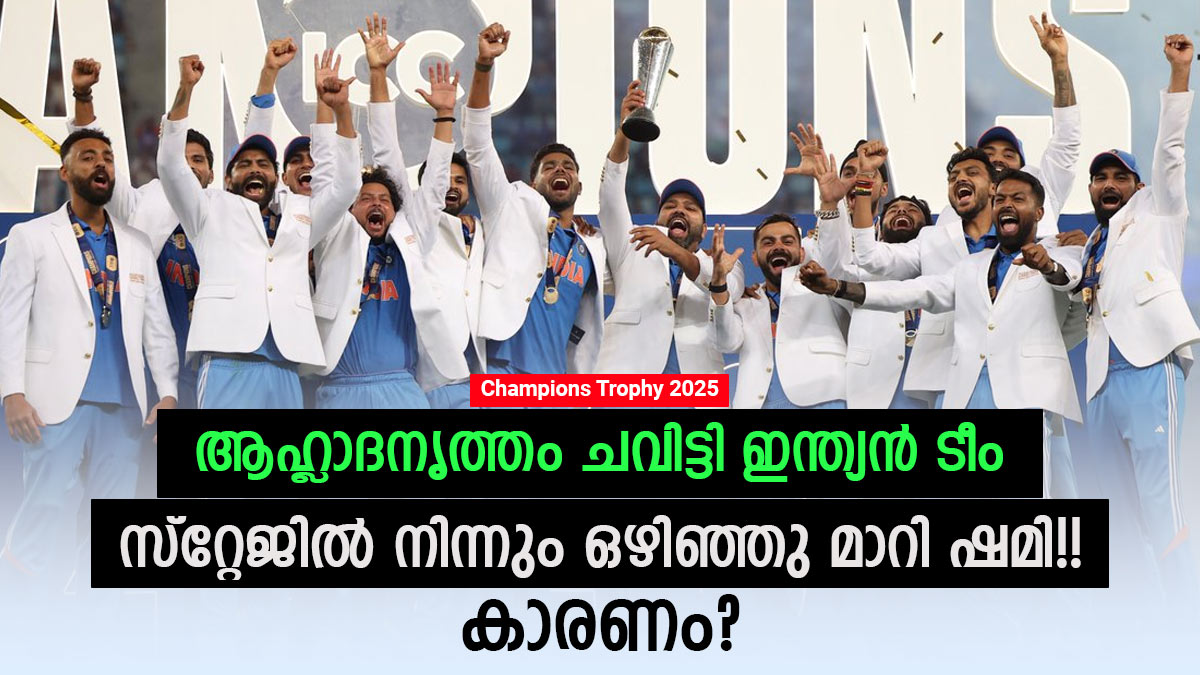 മൂന്നാമത്തെ ചാംപ്യന്സ് ട്രോഫി കൂടിയാണ് ഇന്ത്യന് ടീം തങ്ങളുടെ പേരിലേക്കു ചേര്ത്തിരിക്കുന്നത്. ഇതു ഓള്ടൈം റെക്കോര്ഡ് കൂടിയാണ്. ഏറ്റവുമധികം തവണ ഈ ടൂര്ണമെന്റില് വിജയിച്ച ടീമായാണ് ഇന്ത്യ മാറിയിരിക്കുന്നത്. അതിനിടെ കിരീടമേറ്റു വാങ്ങിയ ശേഷം സ്റ്റേജില് വച്ച് ഇന്ത്യന് ടീമിന്റെ ആഹ്ലാദ പ്രകടനത്തിനിടെ പേസര് മുഹമ്മദ് ഷമി മാറി നില്ക്കുന്ന ദൃശ്യമാണ് സോഷ്യല് മീഡിയയില് ചര്ച്ചയാവുന്നത്. ഇതിനു പിന്നിലെ കാരണമറിയാം.