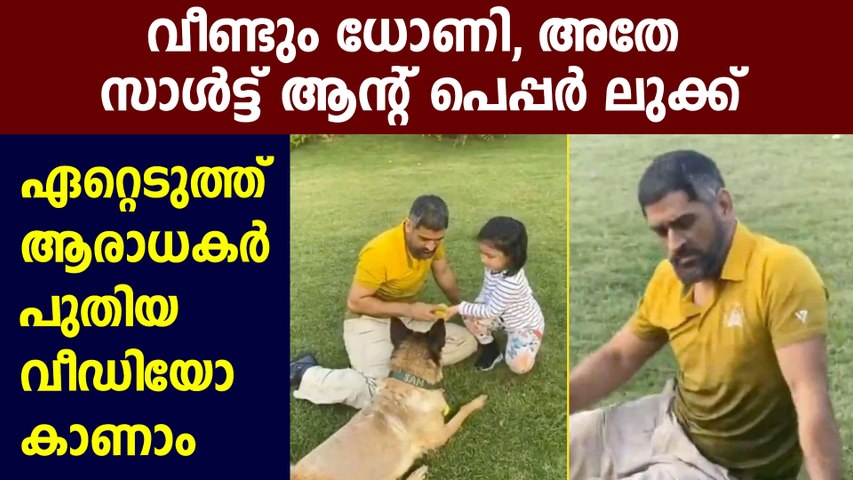 റാഞ്ചിയിലെ ഫാംഹൗസിലെ പുല്ത്തടികിയില് മകളുടെയും വളര്ത്തുനായ സാമിന്റെയും കളി കണ്ടിരിക്കുന്ന ധോണിയെ വീഡിയോയില് കാണാം. അദ്ദേഹത്തിന്റെ ഭാര്യ സാക്ഷിയാണ് ഈ വീഡിയോ പകര്ത്തിയത്. ധോണിയുടേതായി പുറത്തു വരുന്ന മൂന്നാമത്തെ വീഡിയോയാണിത്. നേരത്തേ ഫാം ഹൗസില് മകളോടൊപ്പം ബൈക്കില് ചുറ്റുന്ന അദ്ദേഹത്തിന്റെ വീഡിയോ സാക്ഷി ഇന്സ്റ്റഗ്രാമിലൂടെ പങ്കു വച്ചിരുന്നു.