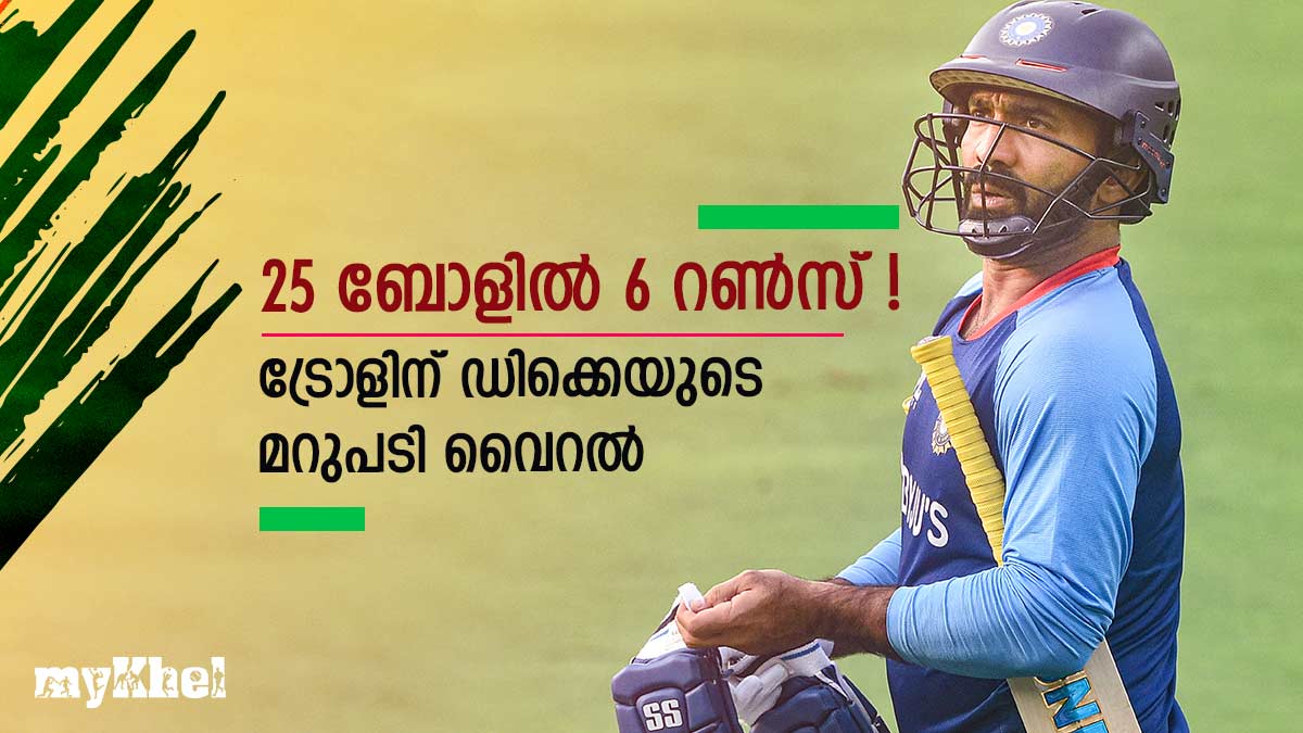 2019ലെ ഏകദിന ലോകകപ്പ് സെമി ഫൈനലില് ന്യൂസിലാന്ഡിനെതിരേയുള്ള കാര്ത്തിക്കിന്റെ സ്ലോ ബാറ്റിങിനെക്കുറിച്ചാണ് ഒരു യൂസര് ട്രോളിയത്. 25 ബോളില് അന്നു ഒരു ഫോറടക്കം ആറു റണ്സ് മാത്രമായിരുന്നു കാര്ത്തിക് നേടിയത്. ഈ സ്കോറിന്റെ സ്ക്രീന് ഷോട്ടിനൊപ്പമായിരുന്നു യൂസറുടെ ചോദ്യം.