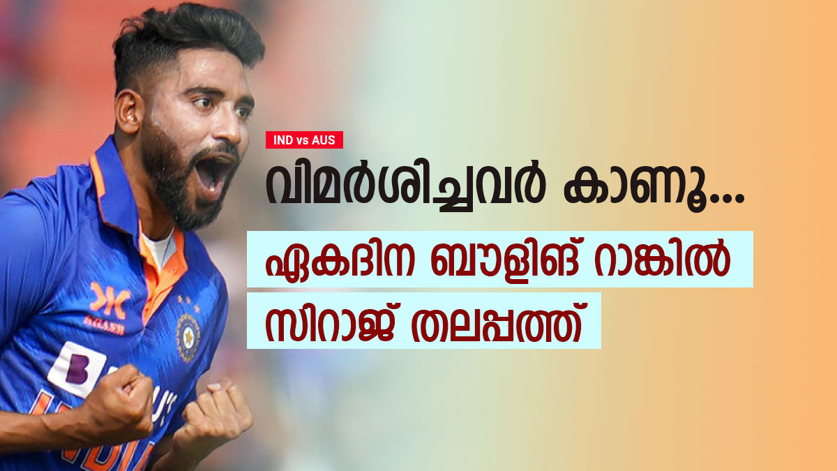 ഒരോവറില്ത്തന്നെ നാല് വിക്കറ്റുകള് സിറാജ് വീഴ്ത്തി. ഈ വര്ഷം നേരത്തെ ഏകദിന ബൗളിങ് റാങ്കിങ്ങില് സിറാജ് തലപ്പത്തേക്കെത്തിയിരുന്നെങ്കിലും പെട്ടെന്ന് തന്നെ ടോപ് ഫൈവില് നിന്ന് താഴോട്ട് പോയി. എന്നാല് ഇത്തവണ വ്യക്തമായ ആധിപത്യം സിറാജിനുണ്ട്. 694 പോയിന്റാണ് സിറാജിനുള്ളത്. ജോഷ് ഹെയ്സല്വുഡ് 678 പോയിന്റോടെ രണ്ടാം സ്ഥാനത്താണ്. ഓസീസ് പരമ്പരയില് തിളങ്ങിയാല് ഒന്നാം സ്ഥാനക്കാരനായിത്തന്നെ സിറാജിന് ലോകകപ്പിലേക്ക് പോകാനാവും.