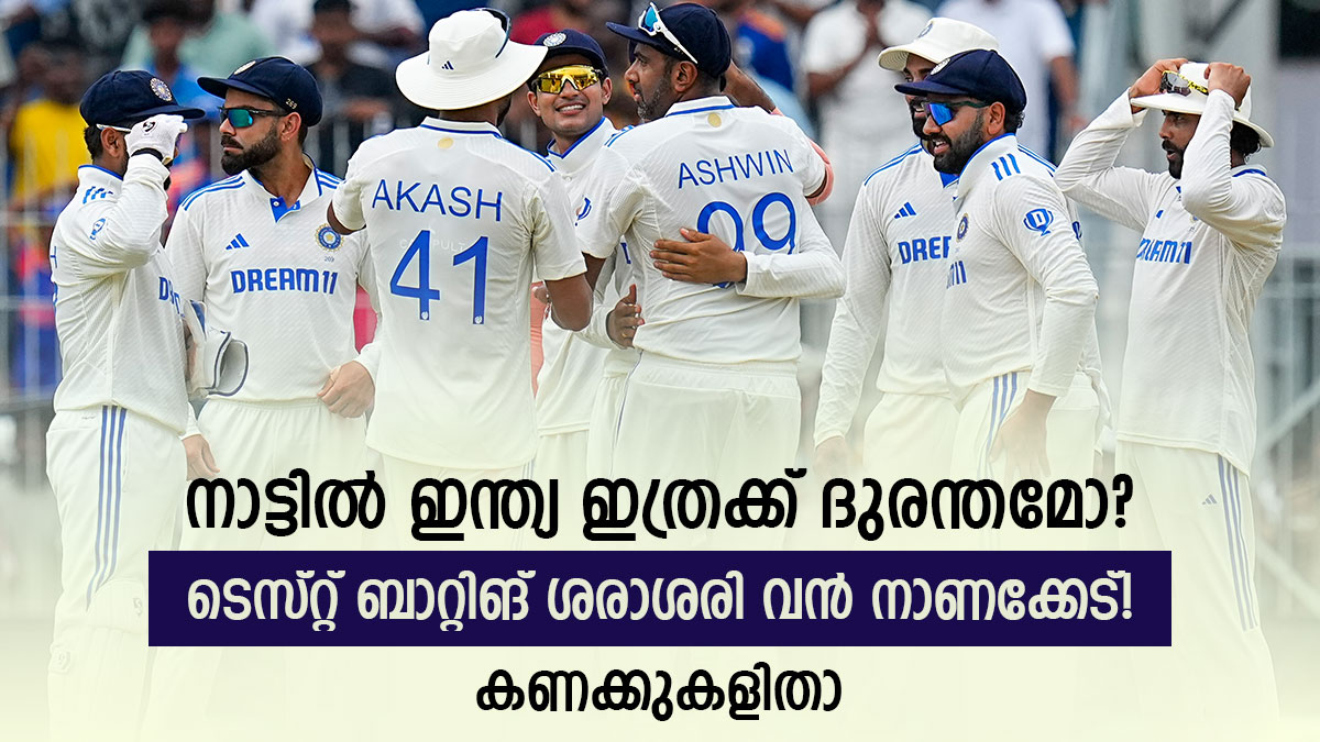 ഇന്ത്യയുടെ ടെസ്റ്റ് ടീമിന്റെ ശരാശരി പരിശോധിക്കുമ്പോള് നിരാശപ്പെടേണ്ടതായിത്തന്നെ പറയാം. ഈ കാലയളവില് 22 മത്സരങ്ങളില് നിന്ന് 25.86 മാത്രമാണ് ഇന്ത്യയുടെ ബാറ്റിങ് ശരാശരി. വിദേശത്ത് ഇതിലും മികച്ച ശരാശരി ഇന്ത്യക്ക് അവകാശപ്പെടാന് സാധിക്കും. എന്നാല് നിലവിലെ ഇന്ത്യയുടെ നാട്ടിലെ കണക്കുകള് നോക്കുമ്പോള് നിരാശയാണ് ഫലം. പേരുകേട്ട ഇന്ത്യയുടെ ബാറ്റിങ് നിരയുടെ കഴിഞ്ഞ കാലത്തെ പ്രകടനങ്ങളെല്ലാം വിലയിരുത്തുമ്പോള് പ്രകടന നിലവാരം ശരാശരിക്കും താഴെയാണെന്ന് തന്നെ പറയാം.