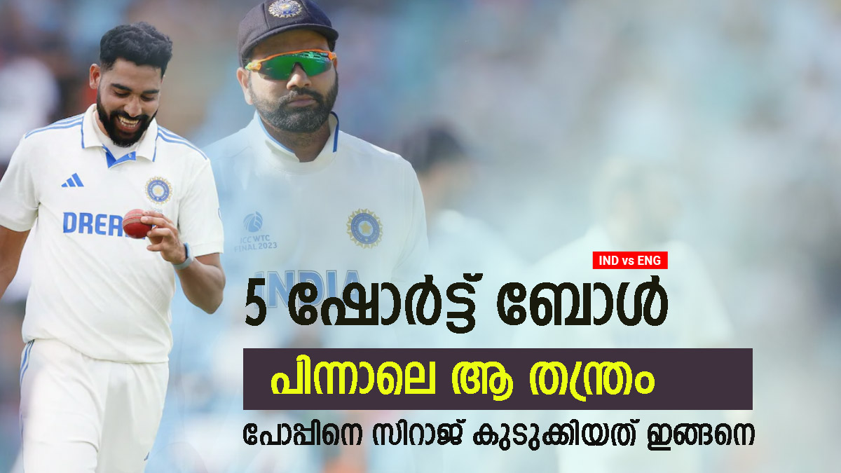 ഇംഗ്ലണ്ടിന് സാക്ക് ക്രോളിയുടേയും (15) ഒലി പോപ്പിന്റേയും (39) വിക്കറ്റാണ് നഷ്ടമായത്. ഇതില് ഒലി പോപ്പിന്റെ വിക്കറ്റ് ഇന്ത്യ നേടിയെടുത്തത് തന്ത്രപരമായാണ്. ഇത് വൈറലായിരിക്കുകയാണ്. മുഹമ്മദ് സിറാജിന്റെ പന്തില് ഒലി പോപ്പ് എല്ബിയില് കുടുങ്ങുകയായിരുന്നു. 55 പന്തില് 5 ഫോറും 1 സിക്സും ഉള്പ്പെടെ പോപ്പ് നിലയുറപ്പിച്ച് വരികയായിരുന്നു. അപ്പോഴാണ് ഇന്ത്യയുടെ രക്ഷകനായി സിറാജ് എത്തുന്നത്. രോഹിത് ശര്മയുടെ തന്ത്രമാണ് സിറാജ് നടപ്പിലാക്കിയത്.