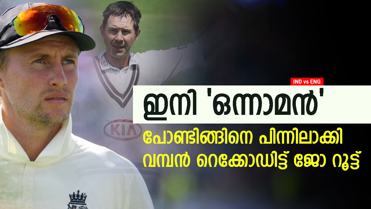 പോണ്ടിങ് 29 ടെസ്റ്റാണ് ഇന്ത്യക്കെതിരേ കളിച്ചത്. 51 ഇന്നിങ്സ് ബാറ്റിങ്ങിനിറങ്ങിയ പോണ്ടിങ് 54.36 ശരാശരിയില് 2555 റണ്സാണ് നേടിയത്. ആദ്യ ഇന്നിങ്സിലെ പ്രകടനത്തോടെ റൂട്ട് പോണ്ടിങ്ങിന്റെ റെക്കോഡിനൊപ്പമെത്തിയിരുന്നു. രണ്ടാം ഇന്നിങ്സില് രണ്ട് റണ്സ് നേടിയതോടെ ഈ റെക്കോഡില് തലപ്പത്തേക്കെത്താന് റൂട്ടിന് സാധിച്ചിരിക്കുകയാണ്. ഇന്ത്യക്കെതിരേ 26 ടെസ്റ്റ് കളിച്ച റൂട്ട് 47 ഇന്നിങ്സില് നിന്നായി 2557 റണ്സാണ് അടിച്ചെടുത്തത്. 60ന് മുകളിലാണ് റൂട്ടിന്റെ ശരാശരി.