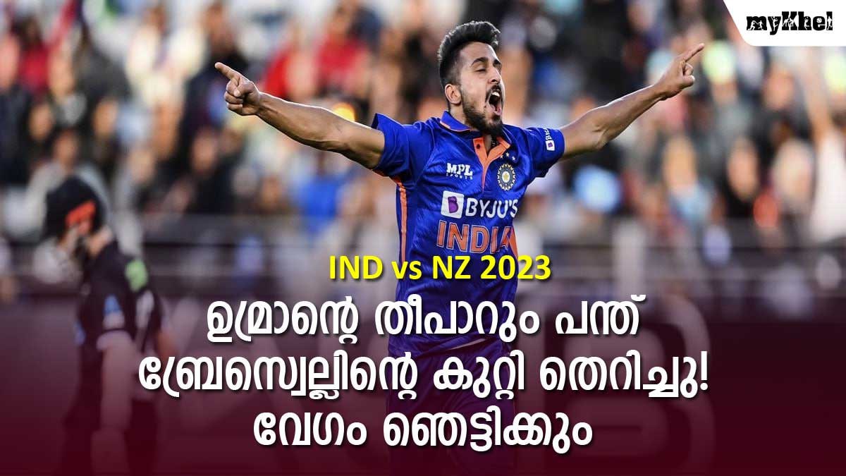 ബ്രേസ്വെല്ലിനെ പുറത്താക്കിയ ഉമ്രാന്റെ പന്തില് ബെയ്ല്സ് പറന്ന ദൂരമാണ് ഇപ്പോള് ചര്ച്ചാവിഷയം. 150 വേഗത്തിലെത്തിയ പന്ത് കുറ്റിയില് തട്ടിയതോടെ ഒരു ബെയ്ല്സ് വിക്കറ്റ് കീപ്പര് ഇഷാന് കിഷന്റെ തലക്ക് മുകളിലൂടെ പറന്ന് തേര്ട്ടിയാര്ഡ് സര്ക്കിളിന്റെ അപ്പുറമാണ് വീണത്.