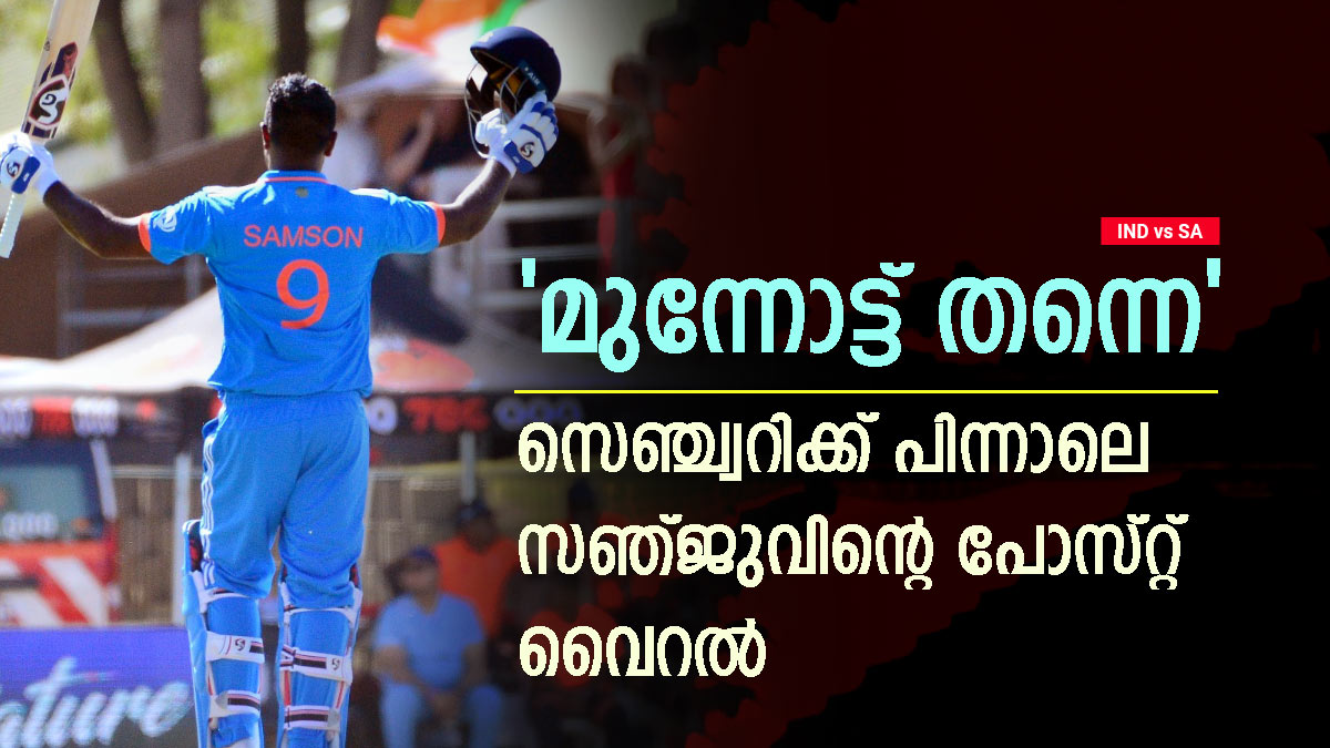 സെഞ്ച്വറിക്ക് പിന്നാലെ സഞ്ജു ബാറ്റുയര്ത്തി കാണികളെ അഭിവാദ്യം ചെയ്യുന്ന ചിത്രത്തോടൊപ്പം മുന്നോട്ട് തന്നെയെന്ന കുറിപ്പാണ് സഞ്ജു പങ്കുവെച്ചിരിക്കുന്നത്. എല്ലാ വിരോധികളോടുമുള്ള സഞ്ജുവിന്റെ മധുര പ്രതികാരമാണ് ഈ പ്രതികരണമെന്നാണ് ആരാധകര് പറയുന്നത്. ഏകദിന ലോകകപ്പില് നിന്ന് തഴയപ്പെട്ട സഞ്ജുവിന് ഇന്ത്യ തുടര്ച്ചയായി അവസരം നല്കിയിരിക്കുന്നത് വളരെ വിരളമായാണ്. മറ്റ് താരങ്ങള്ക്ക് ലഭിക്കുന്ന പിന്തുണ സഞ്ജുവിന് ലഭിച്ചിട്ടില്ല.