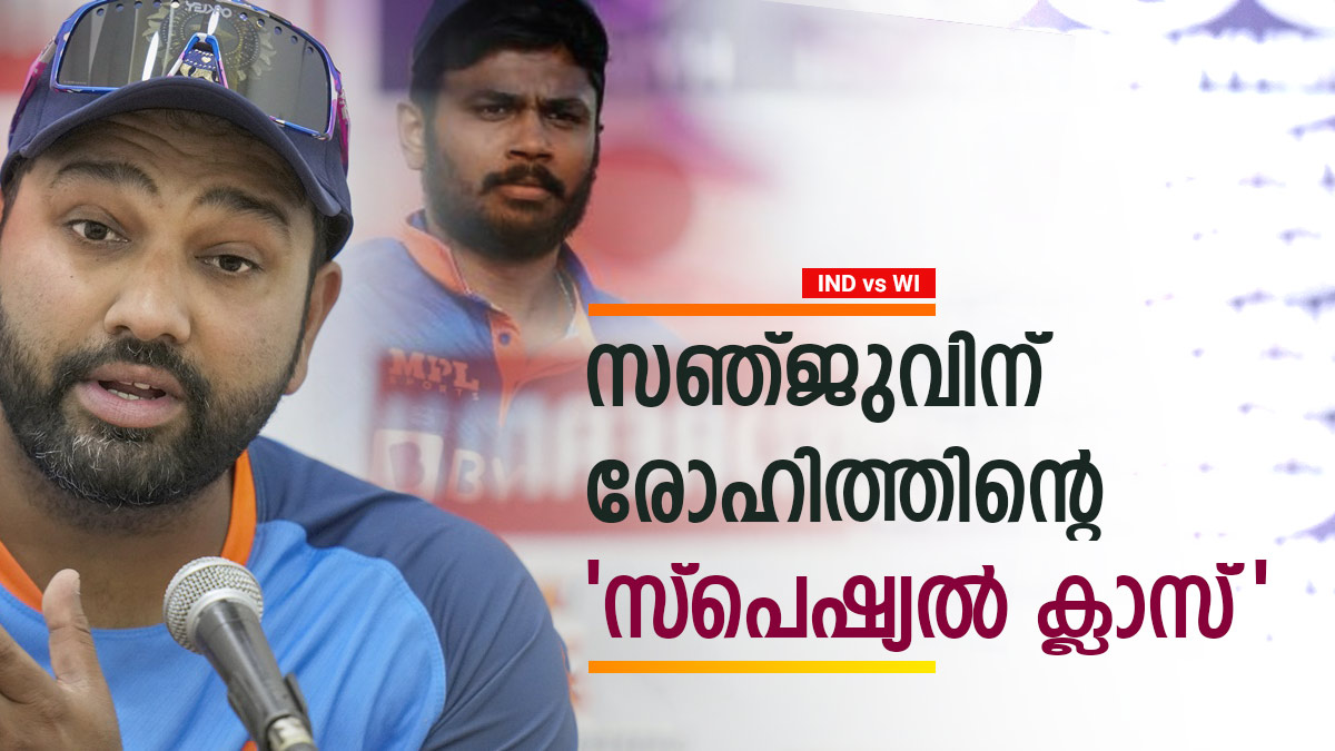 ഗ്രൗണ്ടില് ഇന്ത്യയുടെ മറ്റു താരങ്ങള്ക്കൊപ്പം പരിശീലനം നടത്തവെ രോഹിത് സഞ്ജുവിനു അരികിലേക്കു വരികയായിരുന്നു. തുടര്ന്നു ഏറെ നേരം ഉപദേശിക്കുന്നതും നിര്ദേശങ്ങള് നല്കുന്നതും ഈ വീഡിയോയില് കാണാന് സാധിക്കും. മുന്നോട്ടു കയറി ലെഗ് സൈഡിലേക്കു ഷോട്ടുകള് കളിക്കുന്നതിന്റെ ആംഗ്യവും സഞ്ജുവിന് രോഹിത് കാണിച്ചു കൊടുക്കുന്നുണ്ടായിരുന്നു.