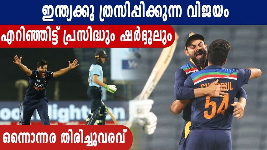 നിര്ണായക വിക്കറ്റുകള് നേടുന്ന തന്റെ പതിവ് ഠാക്കൂര് ഈ കളിയിലും തെറ്റിച്ചില്ല. സെഞ്ച്വറിയിലേക്കു കുതിച്ച ബെയര്സ്റ്റോയെ കുല്ദീപ് യാദവിനു സമ്മാനിച്ച അദ്ദേഹം മോര്ഗന്, ബട്ലര് എന്നിവരെ ഒരേ ഓവറില് പുറത്താക്കിയതോടെ ഇംഗ്ലണ്ട് അഞ്ചിന് 176 റണ്സിലേക്കു വീണു. പിന്നീടൊരു തിരിച്ചുവരവ് ഇംഗ്ലണ്ടിനുണ്ടായില്ല. ആറാം വിക്കറ്റില് ബില്ലിങ്സ്- അലി സഖ്യം ചേര്ന്നെടുത്ത 41 റണ്സെടുത്ത് ഇംഗ്ലണ്ടിനെ കളിയിലേക്കു തിരിച്ചുകൊണ്ടു വരുമെന്ന് തോന്നിച്ചെങ്കിലും ബില്ലിങിന്റെ വിക്കറ്റ് പിഴുത് പ്രസിദ്ധ് ഒരിക്കല്ക്കൂടി അവരുടെ അന്തകനായി.