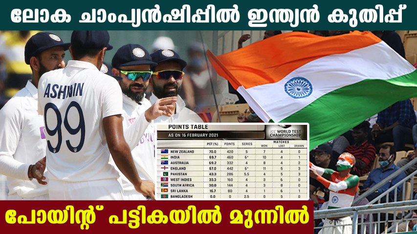 69.7 ശതമാനം പോയിന്റുമായാണ് ഇന്ത്യ ലോക ചാംപ്യന്ഷിപ്പിന്റെ പോയിന്റ് പട്ടികയില് രണ്ടാംസ്ഥാനത്തു നില്ക്കുന്നത്. 70 ശതമാനം പോയിന്റുള്ള ന്യൂസിലാന്ഡാണ് ഒന്നാംസ്ഥാനത്ത്. നേരത്തേ തന്നെ ലോക ചാംപ്യന്ഷിപ്പിന്റെ ഫൈനലിലേക്കു യോഗ്യത നേടിയിട്ടുള്ള ടീം കൂടിയാണ് കിവീസ്. അതേസമയം, ഇന്ത്യക്കെതിരായ വന് പരാജയം ഇംഗ്ലണ്ടിനു കനത്ത തിരിച്ചടിയായി മാറി. ഈ ടെസ്റ്റിനു മുമ്പ് തലപ്പത്തായിരുന്ന അവര് നാലാംസ്ഥാനത്തേക്കു പിന്തള്ളപ്പെട്ടു.