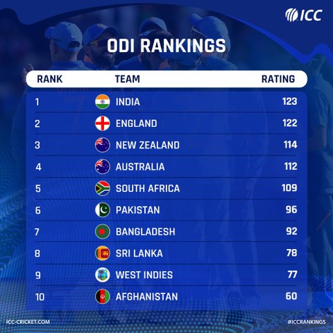 123 പോയിന്റുമായാണ് ഇന്ത്യ റാങ്കിങില് ഒന്നാംസ്ഥാനത്തു നില്ക്കുന്നത്. വെറും ഒരു പോയിന്റ് മാത്രം പിന്നിലായി ഇംഗ്ലണ്ട് തൊട്ടുതാഴെയുണ്ട്. 114 പോയിന്റുള്ള ന്യൂസിലാന്ഡാണ് മൂന്നാമത്. ലോകകപ്പില് സെമിയുറപ്പിച്ച ആദ്യ ടീമും നിലവിലെ ചാംപ്യന്മാരുമായ ഓസ്ട്രേലിയയാണ് 112 പോയിന്റോടെ നാലാംസ്ഥാനത്തു നില്ക്കുന്നത്.
