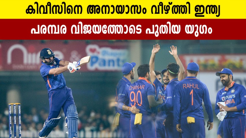154 റണ്സിന്റെ വിജയലക്ഷ്യമായിരുന്നു ടിം സൗത്തി നയിച്ച കിവീസ് ഇന്ത്യക്കു നല്കിയത്. നായകന് രോഹിതും കെഎല് രാഹുമുള്പ്പെട്ട ഓപ്പണിങ് ജോടി ആദ്യ വിക്കറ്റില് സെഞ്ച്വറി കൂട്ടുകെട്ടുണ്ടാക്കിയപ്പോള് തന്നെ ഇന്ത്യ കളി വരുതിയിലാക്കിയിരുന്നു. 117 റണ്സാണ് ആദ്യ വിക്കറ്റില് ഇരുവരും ചേര്ന്നെടുത്തത്. 16 ബോളുകളും ഏഴു വിക്കറ്റുകളും ബാക്കിനില്ക്കെ അനായാസം ഹിറ്റ്മാനും സംഘവും ലക്ഷ്യത്തിലെത്തുകയും ചെയ്തു. രാഹുലിന്റെയും (65) രോഹിത്തിന്റെയും (55) ഫിഫ്റ്റികളാണ് ഇന്ത്യന് വിജയത്തിനു അടിത്തറയിട്ടത്. രാഹുല് 49 ബോളില് ആറു ബൗണ്ടറികളും രണ്ടു സിക്സറുമടിച്ചപ്പോള് രോഹിത് 36 ബോളില് ഒരു ബൗണ്ടറിയും അഞ്ചു സിക്സറും നേടി. സൂര്യകുമാര് യാദവ് (1) പെട്ടെന്നു മടങ്ങിയെങ്കിലും വെങ്കടേഷ് അയ്യരും (12*) റിഷഭ് പന്തും (12*) ചേര്ന്ന് ഇന്ത്യന് വിജയം പൂര്ത്തിയാക്കുകയായിരുന്നു. പരമ്പരയിലെ അവസാന മല്സരം ഞായറാഴ്ച കൊല്ക്കത്തയിലാണ്.