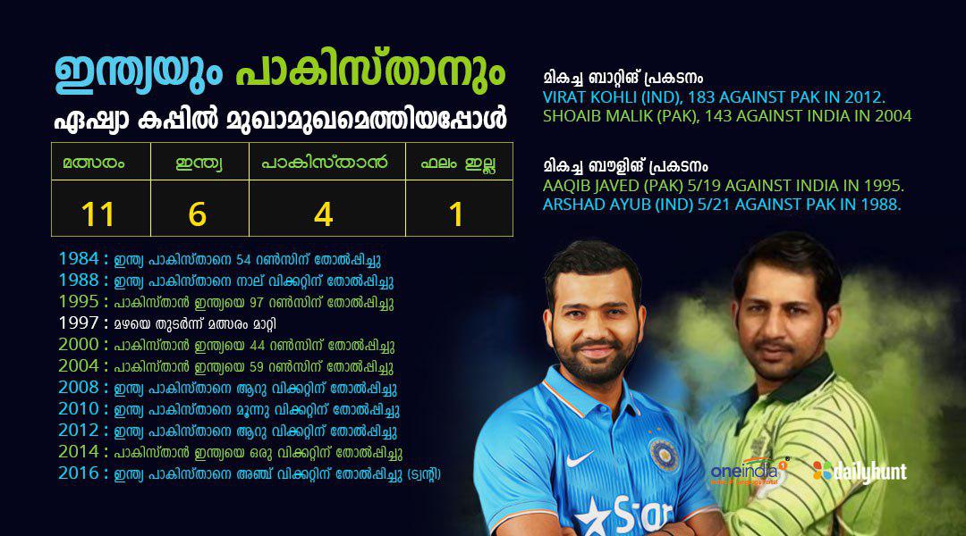ഏഷ്യാ കപ്പില് 12 തവണയാണ് ഇന്ത്യയും പാകിസ്താനും തമ്മില് നേര്ക്കുനേര് ഏറ്റുമുട്ടിയത്. ആറ് മല്സരത്തില് ഇന്ത്യ വിജയക്കൊടി നാട്ടിയപ്പോള് അഞ്ചെണ്ണത്തില് പാകിസ്താന് വിജയിച്ചു. ഒരു മല്സരം മഴയെ തുടര്ന്ന് ഉപേക്ഷിച്ചു.