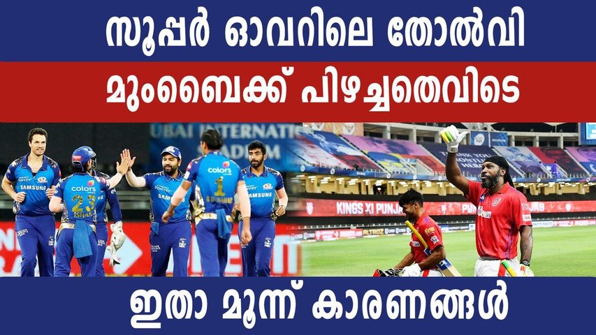 ജസ്പ്രീത് ബൂംറയുടെ ബൗളിങ് മികവില് ആദ്യ പവര്പ്ലേയില് ആദ്യം ബാറ്റ് ചെയ്ത പഞ്ചാബിനെ അഞ്ച് റണ്സിലൊതുക്കാന് മുംബൈക്ക് സാധിച്ചു. എന്നാല് മറുപടിക്കിറങ്ങിയ മുംബൈക്കുവേണ്ടി ബാറ്റിങ്ങിനിറങ്ങിയത് രോഹിത് ശര്മയും ക്വിന്റന് ഡീകോക്കുമാണ്. ഈ തീരുമാനം പാളിപ്പോയി. രോഹിത് ശര്മ ഒരു പന്ത് പാഴാക്കുകയും ചെയ്തതോടെ ആദ്യ സൂപ്പര് ഓവര് സമനിലയില് അവസാനിച്ചു. മോശം ഫോമിലുള്ള രോഹിതിന് പകരം പവര്ഹിറ്ററായ കീറോണ് പൊള്ളോര്ഡോ,ഹര്ദിക് പാണ്ഡ്യയോ ഇറങ്ങിയിരുന്നെങ്കില് മത്സരഫലം മാറുമായിരുന്നു. പഞ്ചാബിന്റെ ബൗളിങ് മികവിനെ വിലകുറച്ച് കണ്ട മുംബൈക്കുള്ള തിരിച്ചടിയായിരുന്നു സൂപ്പര് ഓവറിലെ തോല്വി.