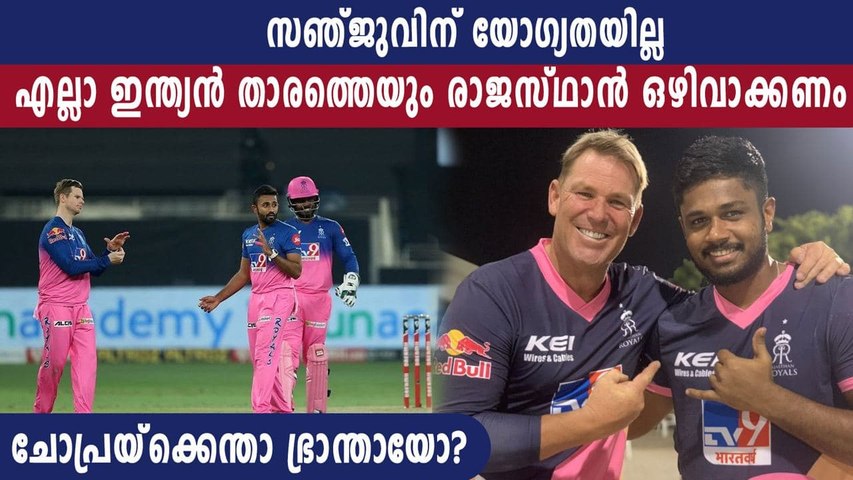 സഞ്ജു സാംസണ്, രാഹുല് തെവാത്തിയ, കാര്ത്തിക് ത്യാഗി, ശ്രേയസ് ഗോപാല് എന്നിവരൊന്നും വലിയ തുക നല്കി നിലനിര്ത്താന് യോഗ്യതയുള്ളവരല്ലെന്നും ചോപ്ര വ്യക്തമാക്കി. മൂന്നു വര്ഷങ്ങള്ക്കു മുമ്പ് നടന്ന മെഗാ താരലേലത്തിനു മുമ്പ് മൂന്നു കളിക്കാരെ ടീമില് നിലനിര്ത്താന് ഒരു ഫ്രാഞ്ചൈസിക്കു 15 കോടി, 11 കോടി, 7 കോടി എന്നിങ്ങനെയായിരുന്നു പണം ചെലവഴിക്കേണ്ടി വന്നിരുന്നത്.