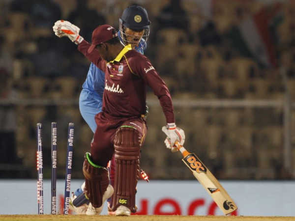 കളിയുടെ 28ാം ഓവറിലായിരുന്നു ധോണി മാജിക്കിന് ലോകം സാക്ഷിയായത്. കീമോ പോളിനൊപ്പം ക്യാപ്റ്റന് ജാസണ് ഹോള്ഡറായിരുന്നു ക്രീസില്. രവീന്ദ്ര ജഡേജയുടെ ബൗളിങില് ക്രീസിന് പുറത്തേക്ക് ഇറങ്ങി ഡിഫന്ഡ് ചെയ്യാന് കീമോ ശ്രമിച്ചെങ്കിലും പിഴച്ചു. പിച്ച് ചെയ്ത ശേഷം ടേണ് ചെയ്ത പന്ത് ധോണിക്ക്. കീമോ കാല് തിരികെ ക്രീസിലേക്കു വയ്ക്കാന് ശ്രമിച്ചെങ്കിലും കണ്ണടച്ചുതുറക്കുന്ന വേഗത്തിലാണ് ധോണി ബെയ്ല്സ് തെറിപ്പിച്ചത്. തന്റെ പേരിലുള്ള 0.19 സെക്കന്റെന്ന സ്റ്റംപിങ് റെക്കോര്ഡ് ധോണി ഇത്തവണ പഴങ്കഥയാക്കുകയായിരുന്നു. ഓസ്ട്രേലിയന് താരം ജോര്ജ് ബെയ്ലിയെയാണ് അന്നു സ്റ്റംപ് ചെയ്തു പുറത്താക്കിയത്.
