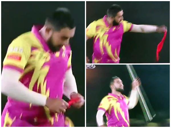 കളിയുടെ എട്ടാം ഓവറില് ഷാംസിയുടെ ബൗളിങില് വിഹാബ് ലൂബെ വമ്പന് ഷോട്ടിന് ശ്രമിച്ച് ഹാര്ഡസ് വില്ജൊയെന് അനായാസ ക്യാച്ച് നല്കി പുറത്തായി. വിക്കറ്റ് നേട്ടത്തില് ആഹ്ലാദം പ്രകടിപ്പിച്ച ഷാംസി റണ്ണിങില് തന്നെ പോക്കറ്റില് നിന്നും ചുവന്ന തൂവാല പുറത്തെടുത്തു വീശി. കണ്ണടച്ചു തുറക്കുന്ന വേഗത്തില് ഈ തൂവാല തിളങ്ങുന്ന ഒരു ദണ്ഡായി മാറുന്നതാണ് കണ്ടത്. കാണികള് മാത്രമല്ല കമന്റേറ്റര്മാര് പോലും ഒരു നിമിഷം അമ്പരന്ന് പോയ നിമിഷമായിരുന്നു ഇത്.