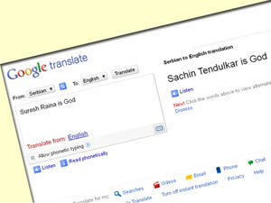 'സുരേഷ് റെയ്ന ഈസ് ഗോഡ്' എന്ന് സെര്ബിയന് ഭാഷയിലെഴുതി ഗൂഗിള് ട്രാന്സ്ലേറ്റിലൂടെ ഇംഗ്ലീഷിലേക്ക് പരിഭാഷപ്പെടുത്തിയാല് ലഭിയ്ക്കുന്നത് സച്ചിനാണ് ദൈവമെന്നായിരിക്കും. ഇത് അംഗീകരിയ്ക്കാന് റെയ്നയ്ക്കും വിഷമമുണ്ടാവില്ലെന്ന് കരുതാം.