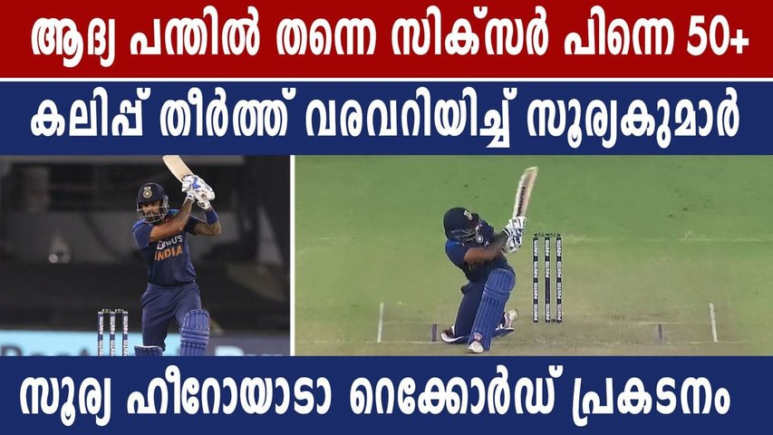 31 ബോളില് ആറു ബൗണ്ടറികളും മൂന്നു സിക്സറുമടക്കമാണ് സൂര്യ 57 റണ്സ് അടിച്ചെടുത്തത്. ഇന്ത്യക്കു വേണ്ടി അരങ്ങേറ്റ ഇന്നിങ്സില് ഫിഫ്റ്റി പ്ലസ് സ്കോര് നേടിയ അഞ്ചാമത്തെ താരം കൂടിയാണ് അദ്ദേഹം. അജിങ്ക്യ രഹാനെ (2011), ഇഷാന് കിഷന് (2021), രോഹിത് ശര്മ (2007), റോബിന് ഉത്തപ്പ (2007) എന്നിവരാണ് മറ്റുുള്ളവര്. ഇംഗ്ലണ്ടിനെതിരേ രണ്ടാം ടി20യില് കളിച്ചുകൊണ്ടായിരുന്നു സൂര്യയുടെ അരങ്ങേറ്റം. പക്ഷെ ഈ മല്സരത്തില് ബാറ്റ് ചെയ്യാന് അദ്ദേഹത്തിന് അവസരം ലഭിച്ചിരുന്നില്ല. മൂന്നാം ടി20യില് സൂര്യക്കു പ്ലെയിങ് ഇലവനില് അവസരം ലഭിച്ചിരുന്നില്ല.