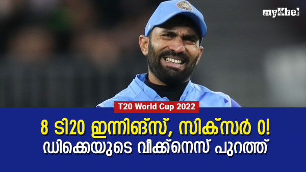 ഈ ടൂര്ണമെന്റിലടക്കം ഇതുവരെ ടി20 ലോകകപ്പില് എട്ടു ഇന്നിങ്സുകളില് കാര്ത്തിക് കളിച്ചുകഴിഞ്ഞു. പക്ഷെ ഇവയില് ഒരു സിക്സര് പോലും അദ്ദേഹം പറത്തിയിട്ടില്ല. 2007ലെ ലോകകപ്പില് മൂന്നും 2010ലെ ടൂര്ണമെന്റില് രണ്ടും ഇന്നിങ്സുകളിലാണ് ഡിക്കെ ബാറ്റ് വീശിയത്. ഇത്തവണയാവട്ടെ ഇതിനകം മൂന്നു ഇന്നിങ്സുകളില് അദ്ദേഹം കളിച്ചു. പക്ഷെ സിക്സറിനായുള്ള കാര്ത്തിക്കിന്റെ കാത്തിരിപ്പ് നീളുകയാണ്.