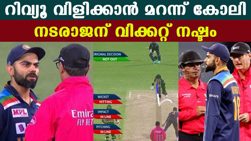 11ാം ഓവറിലെ നാലാമത്തെ പന്തിലായിരുന്നു സംഭവം. ടി നടരാജനായിരുന്നു ഈ ഓവര് ബൗള് ചെയ്തത്. മികച്ച ഫോമില് ബാറ്റ് ചെയ്ത മാത്യു വെയ്ഡിനെ നടരാജന് വിക്കറ്റിനു മുന്നില് കുരുക്കിയെങ്കിലും അംപയര് നോട്ടൗട്ട് വിധിക്കുകയായിരുന്നു. മിഡില്, ലെഗ് സ്റ്റംപുകള്ക്ക് ഇടയിലായിരുന്നു പന്ത് കൊണ്ടത്. നടരാജന് വിക്കറ്റിനായി അപ്പീല് ചെയ്തെങ്കിലും ഫലമുണ്ടായില്ല. സ്ക്രീനില് ഡിആര്എസ് ടൈമര് തെളിഞ്ഞില്ല. ഇതിനിടെ വിക്കറ്റ് കീപ്പര് കെഎല് രാഹുലുമായി സംസാരിച്ച ശേഷം കോലി ഡിആര്എസ് വിളിക്കുകയായിരുന്നു. ബൗണ്ടറി ലൈനിന് അരികില് ഫീല്ഡ് ചെയ്യുകയായിരുന്ന കോലി വ്യക്തത വരുത്തുന്നതിനു വേണ്ടിയാണ് രാഹുലിന്റെ സഹായം തേടിയത്.