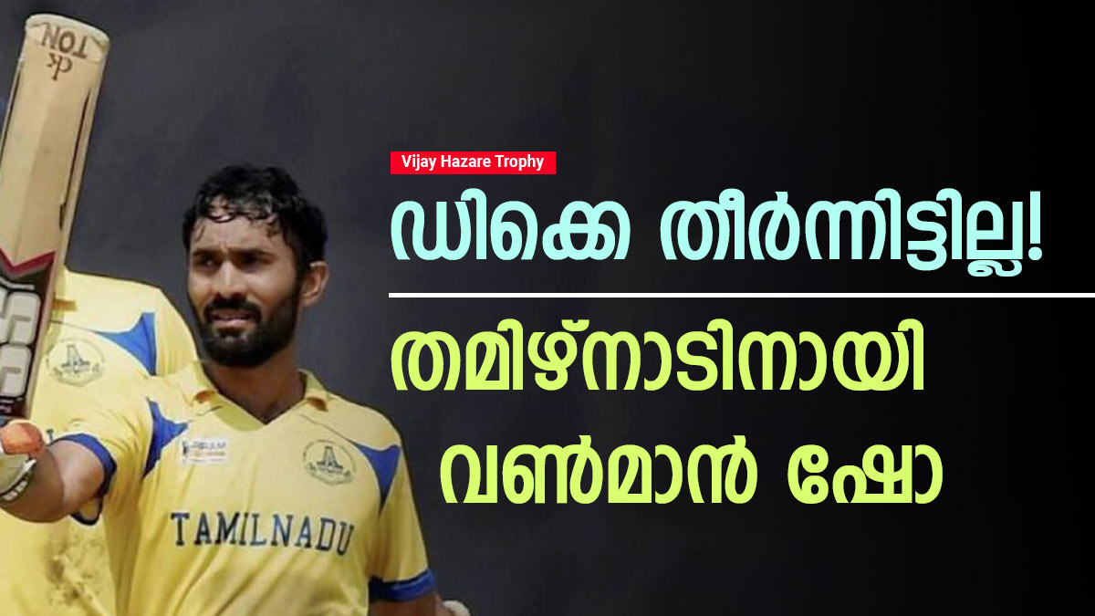 തുടര്ന്നായിരുന്നു ആറാം നമ്പറില് കളിച്ച കാര്ത്തിക് ക്യാപ്റ്റന്റെ ഇന്നിങ്സുമായി തമിഴ്നാടിനെ കൈപിടിച്ചുയര്ത്തിയത്. 93 റണ്സ് അദ്ദേഹം അടിച്ചെടുത്തു. 82 ബോളുകളില് നിന്നായിരുന്നു ഇത്. 13 ഫോറുകളും നാലു സിക്സറുകളും ഡിക്കെയുടെ ഇന്നിങ്സിലുണ്ടായിരുന്നു. പക്ഷെ സെഞ്ച്വറിക്കു ഏഴു റണ്സ് അകലെ നില്ക്കെ അദ്ദേഹത്തെ സിദ്ധാര്ഥ് കൗള് ബൗള്ഡാക്കിയതോടെ തമിഴ്നാടിന്റെ പ്രതീക്ഷ പൂര്ണമായി അസ്മിച്ചു.
