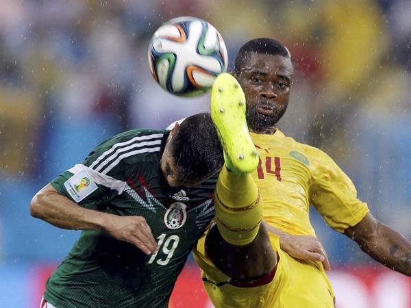 മെക്സിക്കോ താരം പെക്ടര് പെറേരയും കാമറൂണ് കരുത്തന് മാക്സിമും പന്തെടുക്കാനുള്ള ശ്രമത്തില്