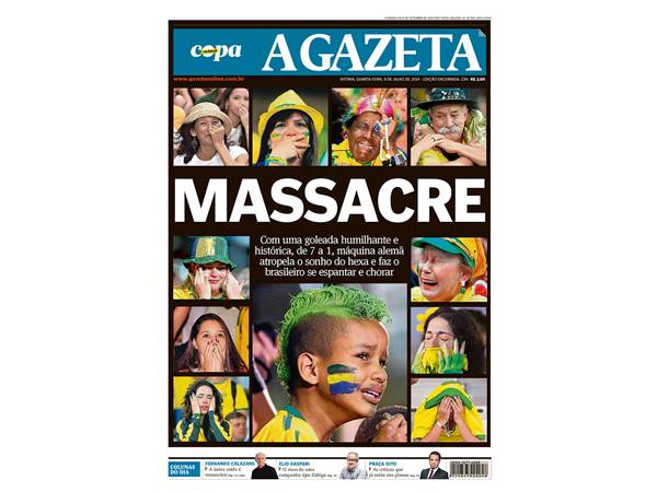 ആറാം ലോകകപ്പ് കിരീടം ലക്ഷ്യം വച്ചാണ് ബ്രസീല് കളിക്കാനിറങ്ങിയ്ത. എന്നാല് ഏഴ് ഗോളുകള് എന്ന ദുരന്തമാണ് സെമിഫൈനലില് ബ്രസീലിന് നേരിടേണ്ടി വന്നത്. ആറെന്നത് സ്വപ്നം, ഏഴെന്നത് ദു:സ്വപ്നം- ഡയറിയോ ഗുച്ചോ എന്ന പത്രത്തിന്റെ ഒന്നാം പേജ് ഇങ്ങനെയായിരുന്നു.