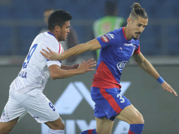 പോയിന്റ് പട്ടികയില് തലപ്പത്തുള്ള ബെംഗളൂരുവിനെ വിറപ്പിക്കുന്ന കളിയാണ് ഡല്ഹി കെട്ടഴിച്ചത്. ബോള് പൊസെഷനിലും ഗോള് ഷോട്ടുകളിലുമെല്ലാം ഡല്ഹി ഒപ്പത്തിനൊപ്പം നിന്നു. ബെംഗളൂരുവിനെ ഞെട്ടിച്ചുകൊണ്ടാണ് ഒമ്പതാം മിനിറ്റില് ഡല്ഹി മുന്നിലെത്തിയത്. നിഷുവിന്റെ ക്രോസ് ബെംഗളൂരു ഗോളി ഗുര്പ്രീത് തട്ടിയകറ്റിയപ്പോള് റീബൗണ്ട് ചെയ്ത പന്ത് ഡേവില്ല വലയിലേക്കു തട്ടിയിട്ടു. 10 മിനിറ്റിനുള്ളില് ബെംഗളൂരു സമനില പിടിച്ചുവാങ്ങി. ഡല്ഹിയുടെ ഗോളിന്റെ റീപ്ലേയായിരുന്നു ഈ ഗോള്. സിസ്കോയുടെ ക്രോസ് പിടിയിലൊതുക്കുന്നതില് ഡല്ഹി ഗോളിക്കു പിഴച്ചപ്പോള് തകര്പ്പനൊരു വോളിയിലൂടെ ബൊയ്താങ് ലക്ഷ്യം കാണുകയായിരുന്നു.