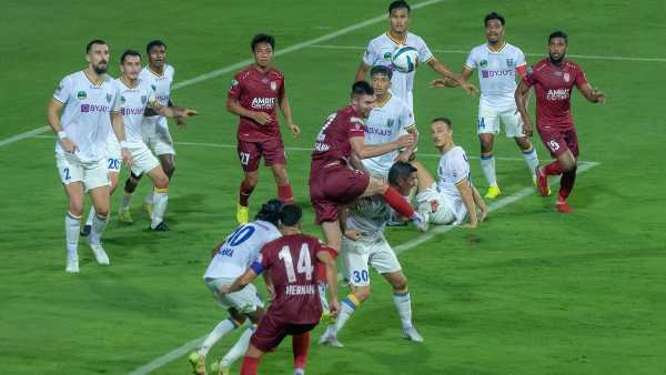 28ാം മിനിറ്റില് നോര്ത്ത് ഈസ്റ്റായിരുന്നു കളിയില് ഗോള്കീപ്പറെ ആദ്യമായി പരീക്ഷിച്ചത്. ഇടതു മൂലയില് നിന്നും ഹെര്നന് സന്റാനയുടെ കോര്ണര് കിക്ക് ഗോള്കീപ്പര് ആല്ബിനോ ഗോമസ് ചാടിയുയര്ന്ന് കുത്തിയകറ്റി അപകടമൊഴിവാക്കി. നോര്ത്ത് ഈസ്റ്റ് താരങ്ങള് പന്ത് പിടിച്ചെടുക്കാന് ശ്രമിച്ചെങ്കിലും പഴുതച്ച പ്രതിരോധമായിരുന്നു ബ്ലാസ്റ്റേഴ്സിന്റേത്. ബ്ലാസ്റ്റേഴ്സ് ഡിഫന്ഡര് പന്ത് ക്ലിയര് ചെയ്തോടെ നോര്ത്ത് ഈസ്റ്റ് നിസ്സഹായരായി.