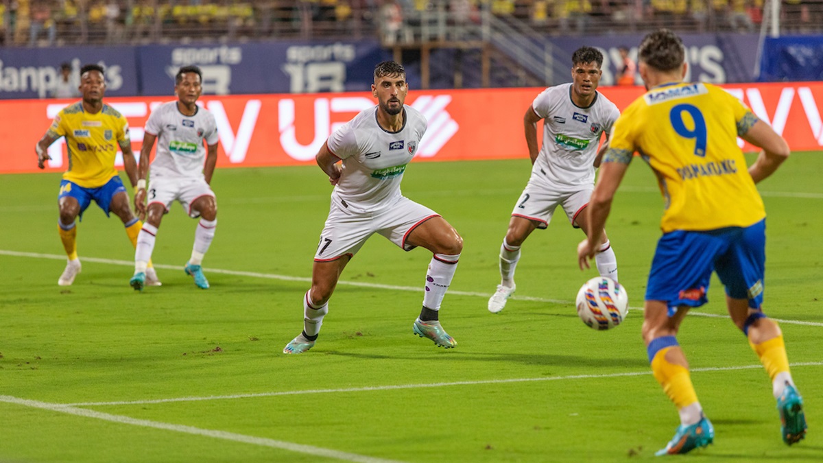 ബോക്സിനുള്ളിലാണ് സംഭവമെങ്കിലും റഫറി ഹാരിഷ് കുന്ഡു പെനല്റ്റി അനുവദിച്ച് കൊടുത്തില്ല. ആദ്യ പകുതി പിരിയുമ്പോള് 1-0ന് നോര്ത്ത് ഈസ്റ്റായിരുന്നു മുന്നില്. എന്നാല് രണ്ടാം പകുതിയുടെ തുടക്കം തന്നെ ബ്ലാസ്റ്റേഴ്സ് ഗോള് മടക്കി. ഫ്രീകിക്കിലൂടെ അഡ്രിയാന് ലൂണ ബോക്സിനുള്ളിലേക്ക് നല്കിയ ക്രോസിനെ ഡാനിഷ് ഫറൂഖി ഹെഡ്ഡറിലൂടെ വലയിലെത്തിക്കുകയായിരുന്നു. എന്നാല് പിന്നീട് ഇരു ടീമിനും ലക്ഷ്യം കാണാനായില്ല.