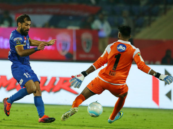 കേരള ബ്ലാസ്റ്റേഴ്സിനെതിരേ കൊച്ചിയില് നടന്ന കളിയില് ചുവപ്പ് കാര്ഡ് വാങ്ങിയ മലയാളി ഗോള്കീപ്പര് ടി പി രഹനേഷിനു പകരം രവി കുമാറിനെ ഉള്പ്പെടുത്തിയാണ് നോര്ത്ത് ഈസ്റ്റ് ഇറങ്ങിയത്. മുന്നേറ്റനിരയില് ലൂയിസ് അല്ഫോന്സോ പെയ്സിനു പകരം ഡാനിലോയെത്തുകയും ചെയിതു. നോര്ത്ത് ഈസ്റ്റിനാണ് കളിയില് ഗോള് നേടാനുള്ള ആദ്യത്തെ അവസരം ലഭിച്ചത്. എന്നാല് ബോക്സിന് തൊട്ടരികില് നിന്നു പെയ്സ് കൈമാറിയ പന്തില് മാര്സിഞ്ഞോയുടെ ഗോളെന്നുറച്ച ഷോട്ട് ക്രോസ് ബാറില് തട്ടിത്തെറിക്കുകയായിരുന്നു. തുടര്ന്നും നോര്ത്ത് ഈസ്റ്റിനു തന്നെയായിരുന്നു കളിയില് മുന്തൂക്കം. എന്നാല് ഫിനിഷിങിലെ പിഴവുകള് അവരെ ഗോള് നേടുന്നതില് നിന്നും തടഞ്ഞുനിര്ത്തി. 26ാം മിനിറ്റില് മാര്സിഞ്ഞോയുടെ പാസില് ഗോള് നേടാനുള്ള മികച്ചൊരു അവസരം നോര്ത്ത് ഈസ്റ്റ് താരം ഡങ്കെല് പാഴാക്കുകയായിരുന്നു.